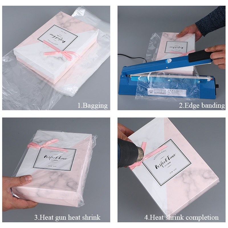 Εφαρμογή: Shrink Film Roll κατάλληλο για συσκευασία ρούχων, κλινοσκεπασμάτων, παζλ θερμικής συρρίκνωσης, χαρτικά, βιβλία, κορνίζες, προμήθειες παρασκευής σαπουνιού, βόμβες μπάνιου, μπουκάλια λαδιού, θήκες CD DVD, δώρα, κεριά, καλλυντικά, παπούτσια, μπουκάλια κρασιού, μικρά καλάθια δώρων, χειροτεχνίες DIY κλπ.